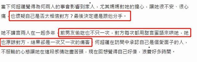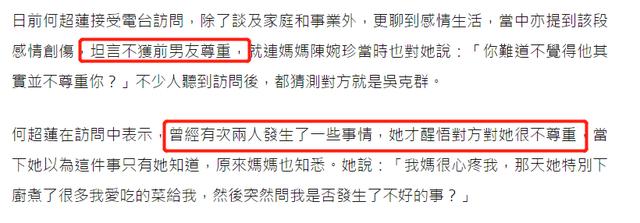 何超莲在周扬青千言万语的离别和表白中留下了一句话:“我经历了你所经历的,我知道这有多痛苦。我钦佩你的勇气,让我振作起来。”被怀疑暗示他被男朋友欺骗了。然而,她和吴克群已经约会了四年,在此期间,她的丈夫也经常接触八卦。网友猜测何超莲的前男友是吴克群。