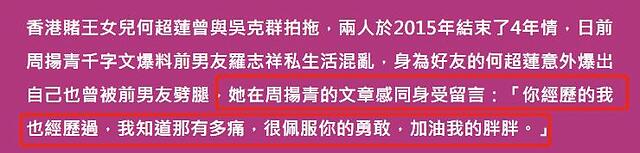 4月29日,台湾媒体报道称,最近周扬青和罗志祥的分裂引起了轩然大波。赌王的女儿何超莲公开留言支持周扬青,并透露她的前男友欺骗了她,这是一个悲伤的故事。后来,她的现任男友窦晓上传了一组情侣的私人照片,并用实际行动来安慰和温暖他的女友何超莲,引发了一场激烈的讨