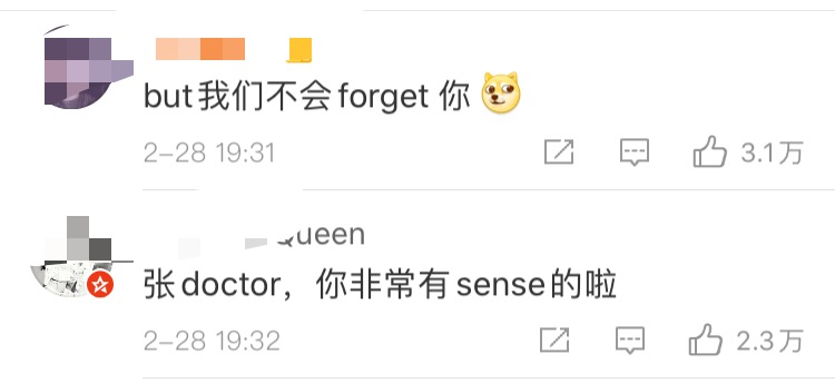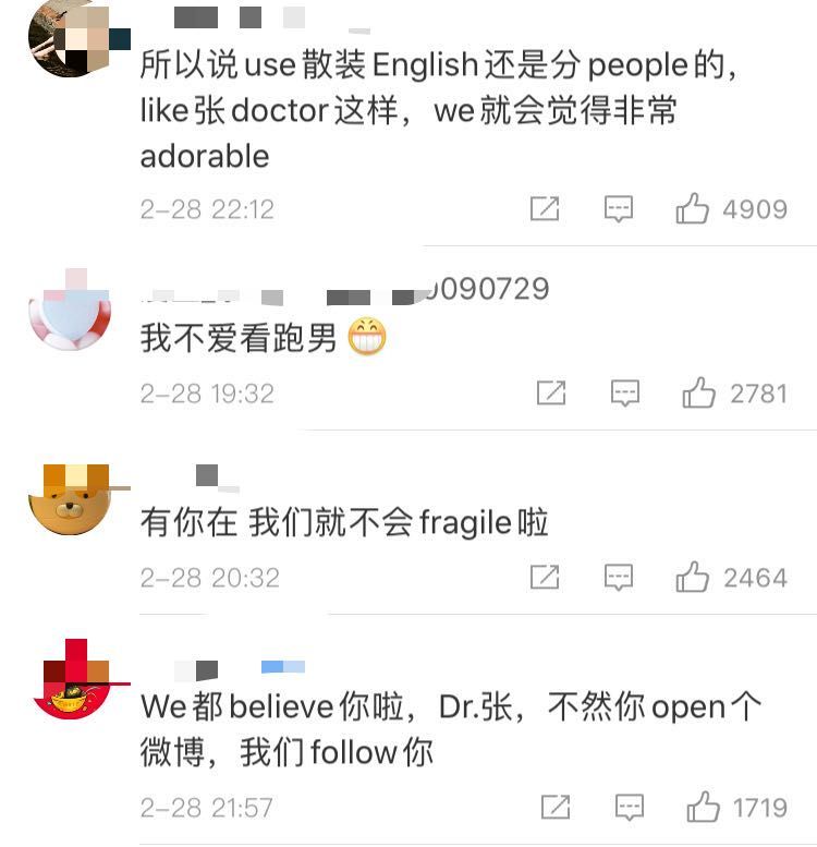 网友对此的回复也很可爱:“所以说use散装English还是分people的,like张doctor这样,we就会觉得非常adorable”、“but我们不会forget你”↓↓↓