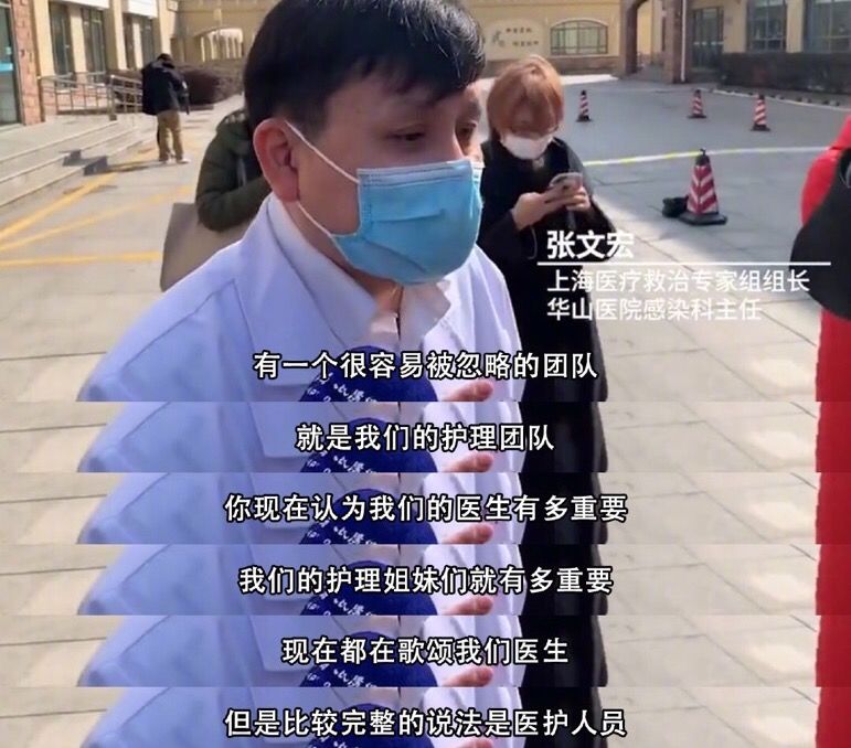 这段时间,张文宏还为广大护士发声,认为医生值得尊敬,也不要忽略护理团队,还有广大的老百姓,大家都在一起努力抗疫,每个人都功不可没。
