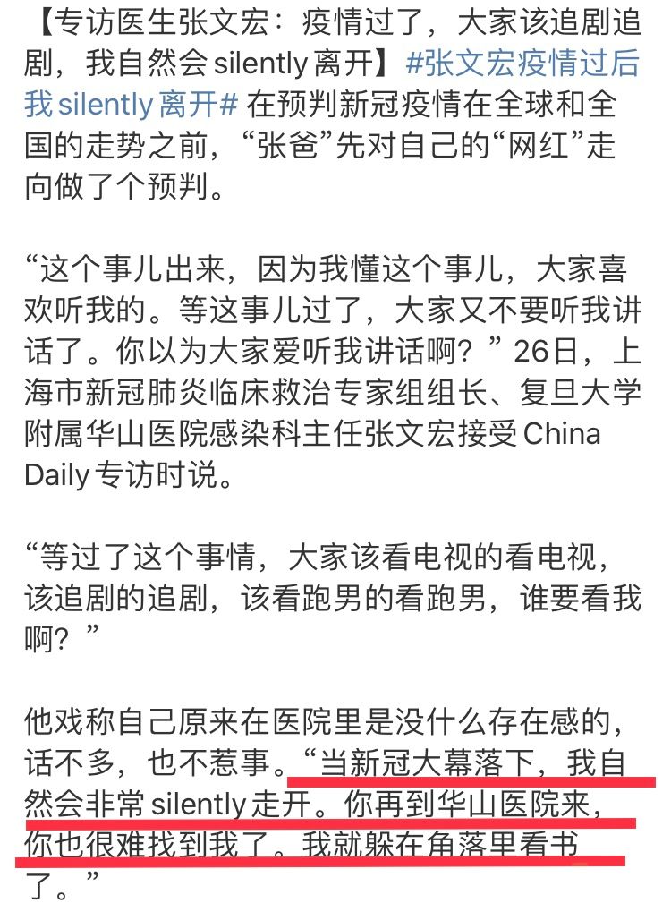 张文宏医生私下完完全全是普通人的样子,他本人也拒绝光环,用散装English预测了自己的“网红”走势:“疫情过去了,大家该追剧追剧,我自然会silently离开”。