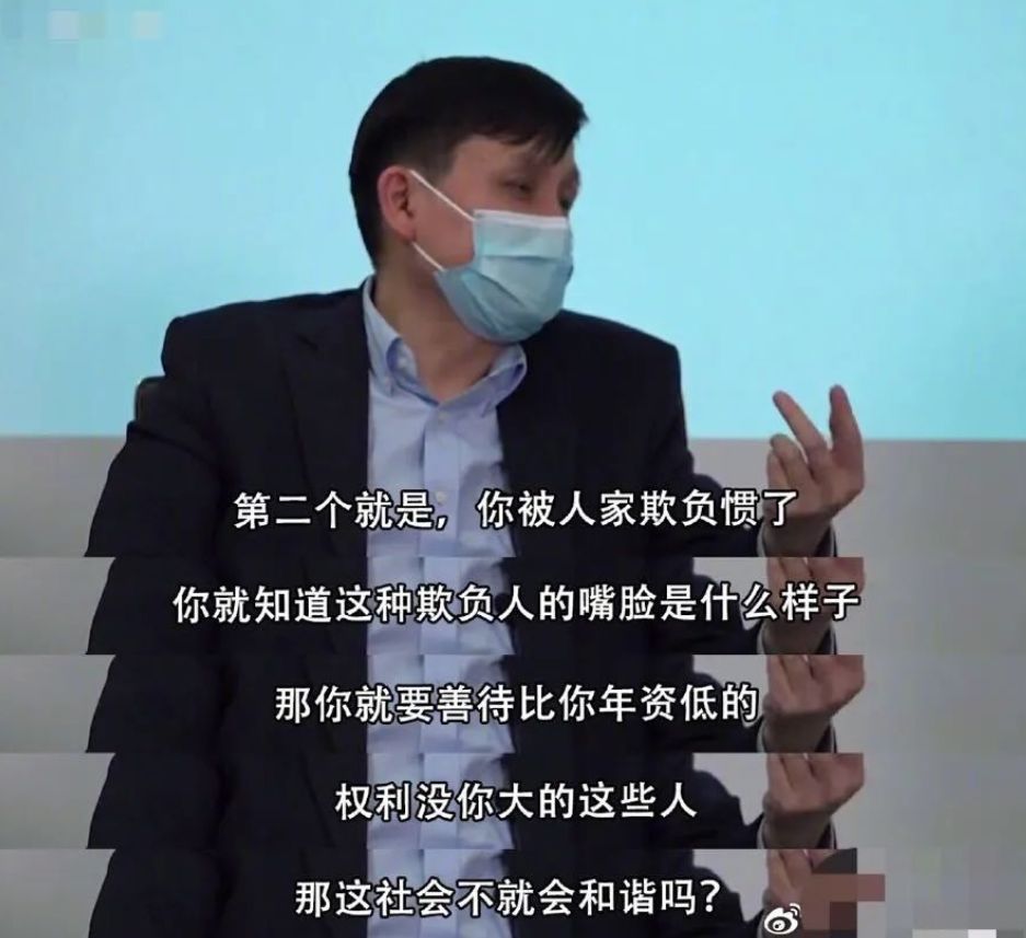 张文宏还指出了善待晚辈的事情:“你被人欺负惯了,你就知道欺负人的嘴脸是怎样的,你就要善待比你年纪小的、权力没你大的人。”
