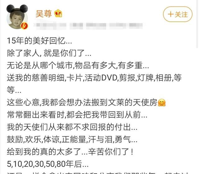 后来,吴尊还发了一封信,感谢这些粉丝一直和他在一起,用爱来对待他的粉丝,他说他仍然会带他们出去反思和分享他在那些年一起度过的日子。