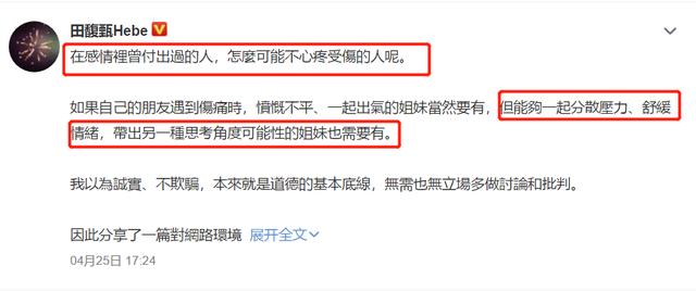 根据过去的经验,陈梅峰认为我们应该珍惜现在,即使有纠葛和困惑,但一旦我们作出决定,我们应该学会放手,不要担心悲伤的事情。事实上,罗志祥在圈子里的许多朋友都贴出文章暗示周扬青是一个“恐怖分子的情人”,罗志祥的恶行不应该被揭露而毁掉他的事业。就连赫布·田馥甄也转发了这些文章,认为这个女人不应该被曝光,这让网民们感到震惊:他们都是女人,她的同情心实际上是给予了男人,而不是受害者的女人。