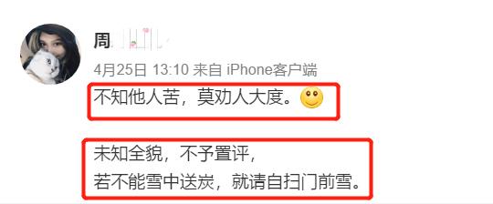 此后,周扬青在小号上疑惑地回答赫伯:“不要在不知道别人的痛苦的情况下说服别人宽宏大量。我不想评论整个情况。如果你不能及时提供帮助,请清扫门前的积雪。"
