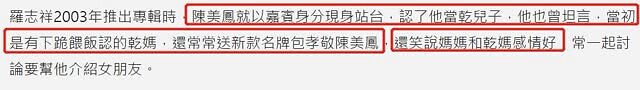 63岁的陈美凤曾出演过台湾电视剧《无爱》、《重生》、《风水世家》,深受观众喜爱。据报道,2003年罗志祥发布专辑时,陈美凤作为嘉宾出现在平台上,并认出小猪是她的养子。小猪也承认,他跪下来喂她,正式承认陈梅凤是她的养母,并经常给她新的名牌包。
