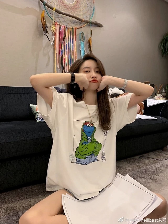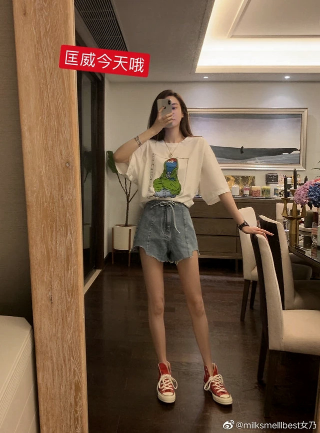 4月28日,张大奕更新了她的微博喇叭,并发布了一系列照片。她穿着卡通上衣和牛仔短裤,露出修长的双腿。