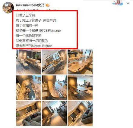 一些网民拿出了照片中的椅子,每一把都是20世纪70年代的古董。从网上搜索的相同椅子来看,只有一把价值6800元,而张大奕给她的工作室配了八把这样的椅子,总共54400元,约合55000元。