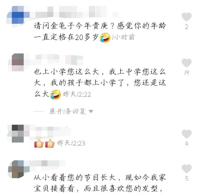 网友们也留言说:“请问今年这只甲虫多大了?我觉得你的年龄已经固定在20多岁了。,& quot你上小学的时候这么老,我上中学的时候这么老,我所有的孩子都上小学,你还是这么老。,& quot我从小看着你的节目长大,现在我的宝贝继续看“等等”。