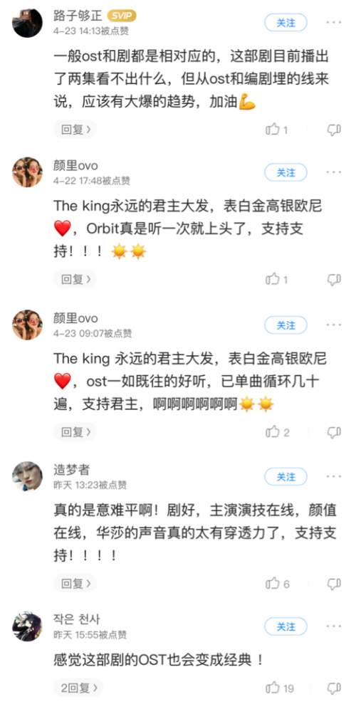 热狗立刻给粉丝们带来了《国王:永恒的君主》的原声带。曝光的前八首曲目揭示了更丰富的情节信息。网友们在评论区发起了一个情节讨论模式,称“应该有一个由《外层空间条约》和编剧埋没的大爆炸趋势”。