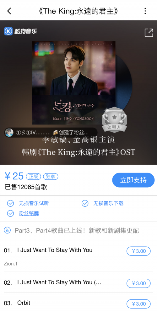 对于那些仍然对节目不满意的粉丝,去酷狗搜索“李敏镐”进入特别页面,并购买支持收听“国王:永恒的君主”的好作品《OST》。页面被打包并同时交付给一系列经典韩剧,由李敏镐主演的《城市猎人》、《继任者》和《蓝海传奇》,充满了回忆。我的朋友们记得要密切关注酷狗,最新和最热门的歌曲资源都迫不及待地呈现出来。
