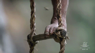 竹竿凿入岩壁以封闭身体,右脚固定刀具,左脚踩在藤梯上作为全身的唯一支撑。