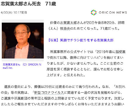 4月30日,据日本媒体报道,日本演员志贺广太郎于本月20日晚死于咽部肺炎,享年71岁。他的办公室,官方网站,宣布了这个消息。志贺广太郎的葬礼于本月29日举行,只有家人参加。至于欢送会,需要根据疫情情况改日举行。