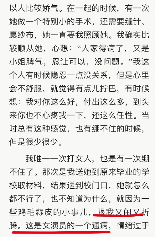 他的女朋友动了手术,即使是小手术,让他陪着照顾她是不对的。他的女朋友耍了点小脾气。他没有选择容忍,但他选择了暴力?他认为是巴掌和拳头让女人诚实,而不是相互理解和宽容,以及细心的照顾。