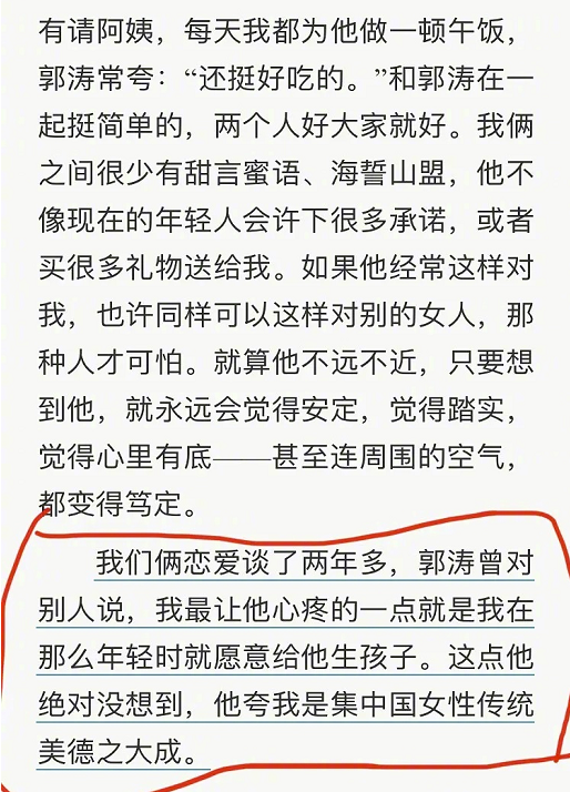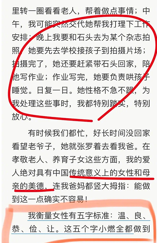 然后,郭涛开始支持他的妻子李燃,称赞她工作有多努力,如何管理她的家庭,如何教育她的孩子,以及她的性格和脾气有多好。他甚至称赞李燃的《我的爱人绝对具有中国传统意义上的女性和母亲的美德》,甚至称赞李燃达到了他所称的衡量女性(中国传统女性的成就)的“热情、善良、谦虚、礼貌、顺从”五字标准。