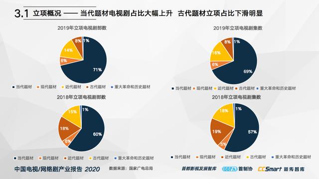 “古装剧数量的急剧下降”也反映在每年电视剧的归档上。根据春节期间发布的《中国电视剧/网络电视剧产业报告》(2020),2019年电视剧中古装题材的比例仅为8%,远低于2018年的15%。