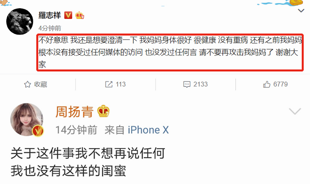 4月29日,罗志祥在他的微博上发布了另一条消息。他写道:“对不起,我还是想澄清一下,我妈妈身体很好,没有重病。此外,我母亲以前从未接受过任何媒体采访或讲话。请停止攻击我的母亲。谢谢你