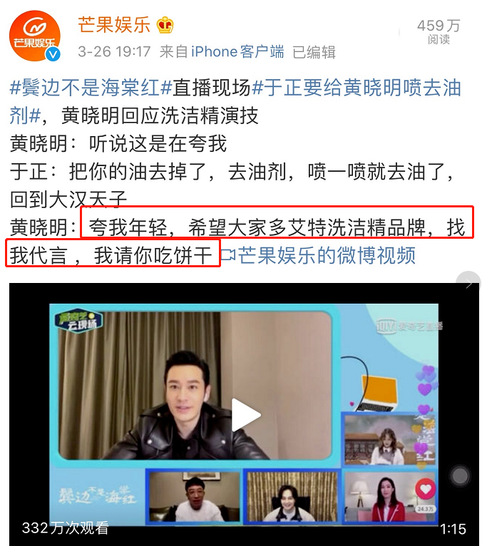 黄晓明听了之后,不仅一点也不尴尬,还利用这个机会说了一句“表扬我年轻”。我希望每个人都支持我,邀请你吃饼干。”