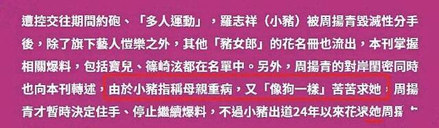 据台湾媒体报道,一名自称是周扬青最好的朋友的人透露,“周扬青决定暂时停止披露,因为小猪指着她母亲的重病,像狗一样恳求她。”这使得网民对女人手中的“破坏性材料”更加好奇。