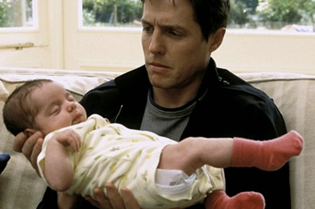 ▲电影《关于一个男孩》的剧照。面对下一代,抱着小蓓的鼻子害怕的表情可能是世界上所有流浪男人的共同的终极恐惧,因为孩子来了,责任也就来了。