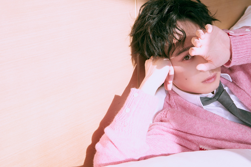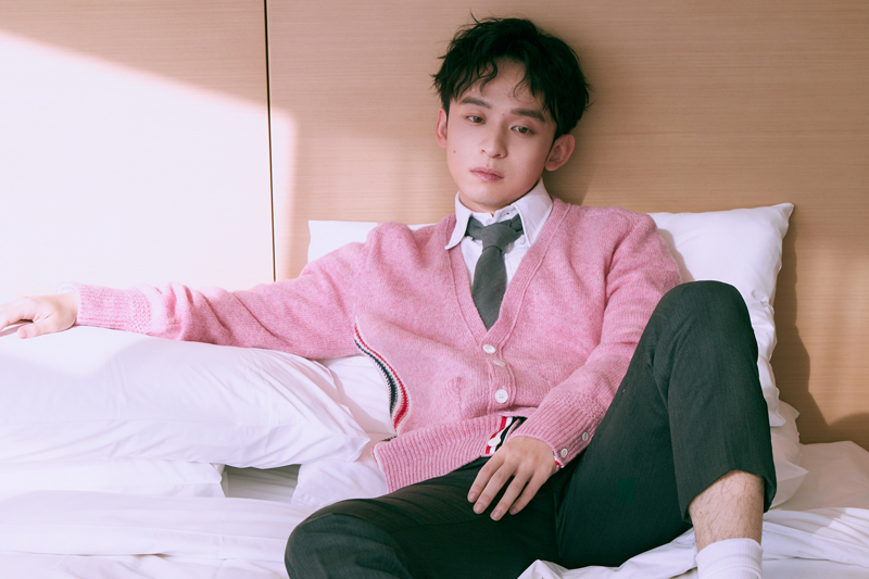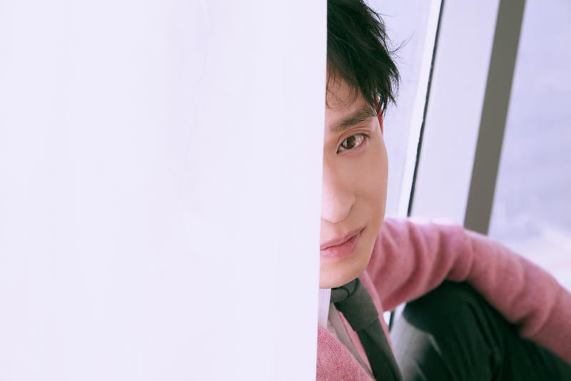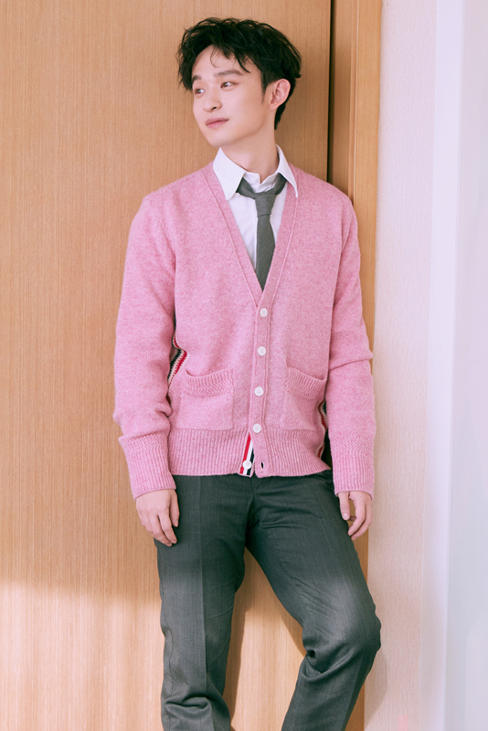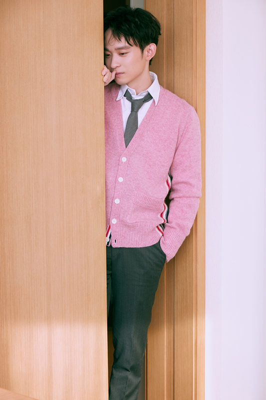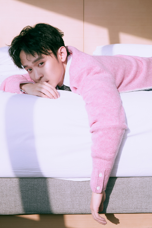 最近,一组董子健的新照片曝光了。他穿着一件纯白衬衫,系着一条铅灰色领带,一条同色系西装裤,还有一件桃红色毛衣来增加柔情。头发微微卷曲,眼睛柔软,纯净而温柔。