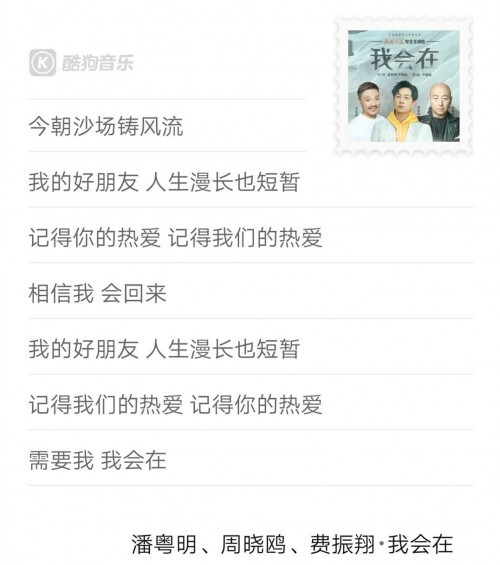 如果你想用一个词来形容这首歌“我会在那里”,那么“跨界”这个词尤其合适。潘粤明和费阳分别作为演员和导演演唱歌曲。两位“跨界歌手”的表演令人惊讶。一些粉丝甚至在酷狗音乐评论区表达了潘粤明温柔的“小烟声”。曾经以“爱我”等歌曲在“零乐队”走红的周晓鸥,最近在各种音乐综艺节目中崭露头角,在《龙陵秘笈》中扮演“马达仁”角色后,凭借高超的演技再次重返乐坛。这一次在《我会在》中的表演,让粉丝们在酷狗评论中发挥粉丝不得不感叹其强大的歌唱力量。