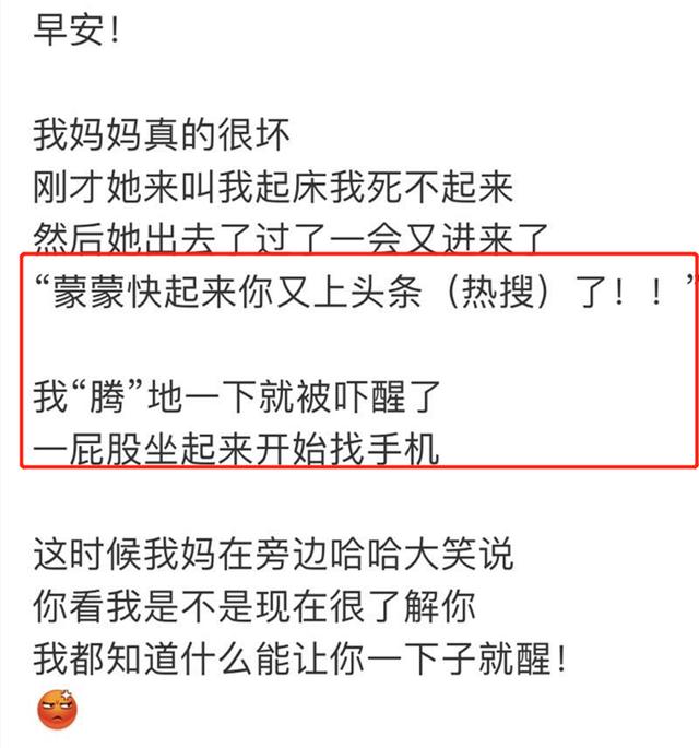 然而,今天早上的问候有些不同。周扬青透露,周的母亲用她独特的技巧欺骗了她的女儿,一再要求她起床,但没有成功。“你又上头条了(热门搜索)!!”结果,周扬青突然醒来,坐起来寻找他的手机。看到女儿的反应,周的母亲突然大笑起来,轻声说:“我知道一切能立刻把你叫醒的事。”