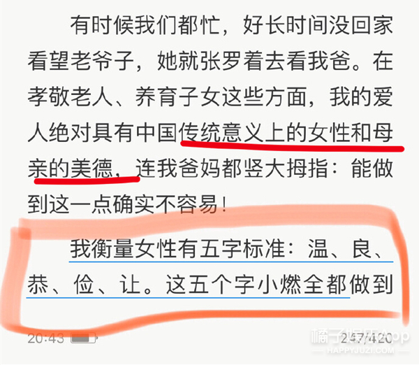 “我有一个衡量女性的五字标准,‘热情、善良、礼貌、节俭和顺从’这五个字都已完成。"