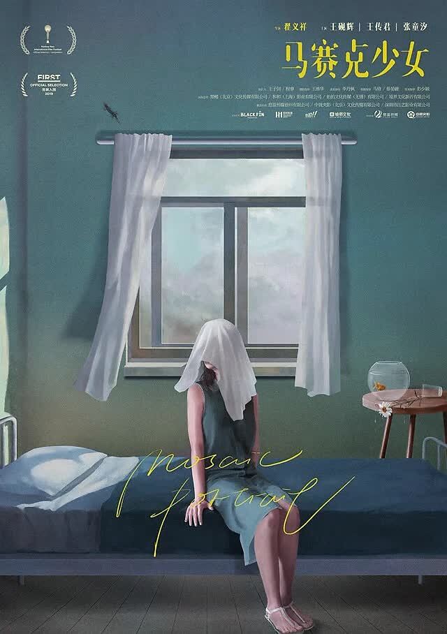“马赛克女孩”的海报选择在安静温和的氛围中嵌入各种与死亡相关的符号——比如女孩头上的白布。这个暗示不仅指向死亡本身,也象征着年轻女孩青春的被迫终结。背景中落下的眼镜、雏菊和鱼缸成为不安和脆弱的图像。