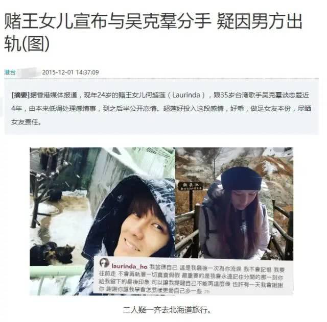 最血腥的部分是与比自己大12岁的台湾演员吴克群的4年恋情。起初,吴克群没有向公众披露他的关系。后来,他去北京录制“梦想合唱团”,因为他需要留在北京。何超莲因为爱情离开了香港,在北京呆了很长时间。后来,吴克群终于和外界建立了关系,并承诺“我会好好照顾她”