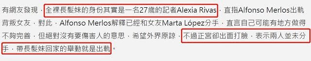 然而,阿方索·梅洛斯的解释很快就被他的女友驳倒了。据报道,他的艺术家女友玛尔塔L & oacute皮兹公开表示两人并没有分手,并指出阿方索·梅洛带辣妹回家的举动是欺骗和背叛。