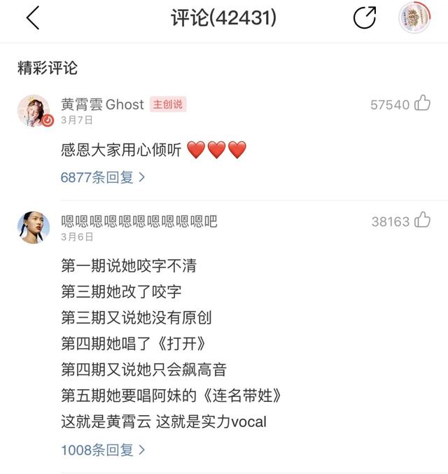 但在接下来的比赛中,黄霄云证明了自己的实力,赢得了观众的认可——所有这些都反映在网易云音乐的评论部分。在这些节目之后,对黄霄云参赛歌曲的评论数量突破了20000条。