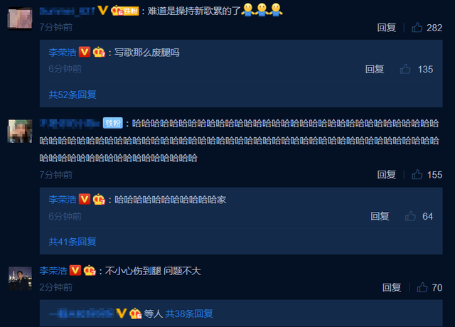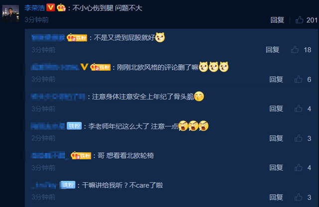 李解释说,他不小心弄伤了自己的腿,但这不是什么大问题,但调皮的粉丝们有不同的绘画风格:“再烧屁股不好”,“注意身体,注意安全,老了,骨头脆了”,“李小姐老了,要注意”。