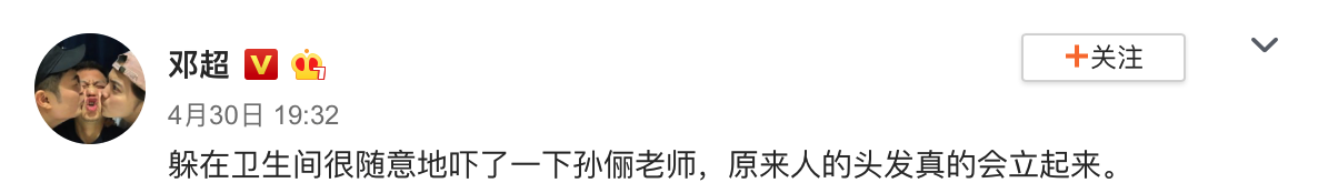 4月30日,邓超与孙莉分享了一个有趣的故事:“躲在浴室里吓着了孙莉小姐。事实证明,人们的头发真的会竖起来。”