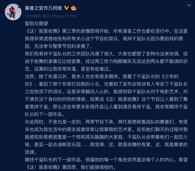 导演在一个帖子中说,易烊千玺暂时离开了《街舞3》。