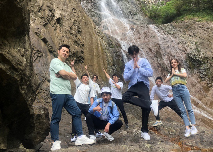 新男子跑步队的成员有不同的姿势和温暖可爱的照片。