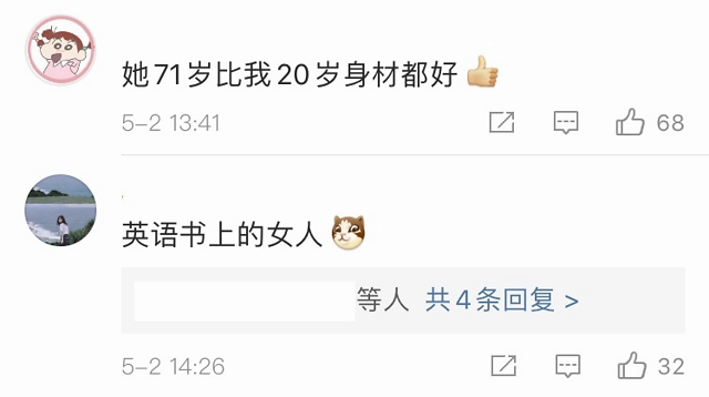 网友们发表了许多评论:“我17岁时从未有过这样的身材”,“71岁的皮肤如此娇嫩”,“跪下,她71岁的身材比我20岁的好”......