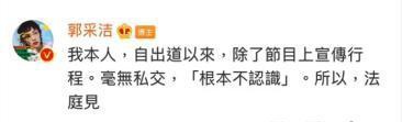 5月2日,郭采洁在社交媒体平台上发布了另一段视频,回应他与罗志祥的关系,称自从他出道以来,除了节目宣传之外,他没有任何私人关系,所以他根本不了解罗志祥。我们决心起诉那些散布谣言的网民,面对外界对郭采洁的诽谤,我们决心证明自己的清