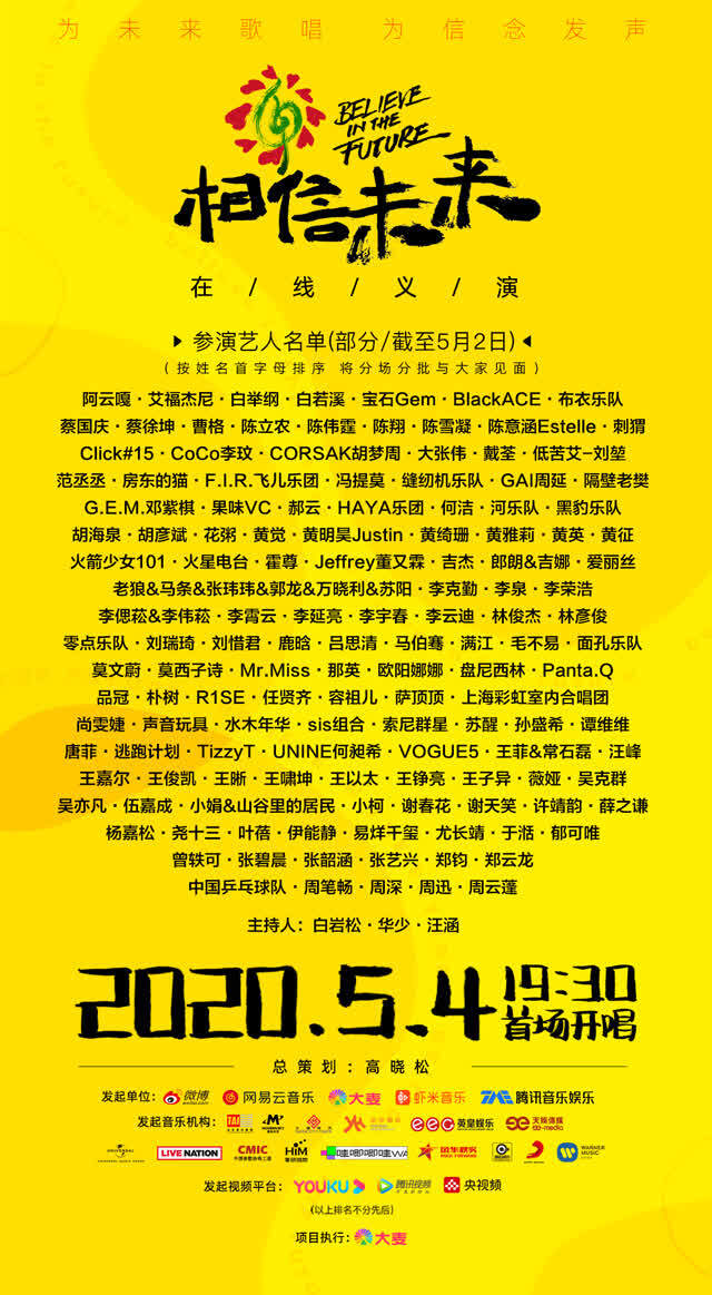 来自北京的消息(记者刘震)5月2日,由新浪微博、网易云音乐、大麦、虾米音乐、腾讯音乐娱乐集团联合主办的“相信未来”网络慈善秀首场演出正式定于5月4日19:30举行。这场慈善演出由著名主持人白、王涵和主持,预计将分三到四个时段播出。整个慈善演出的基调是“战胜焦虑,回归日常生活”。节目并不局限于一种形式,各种各样的音乐形式,如流行音乐、摇滚乐、民谣、古典音乐等等,都以多种形式呈