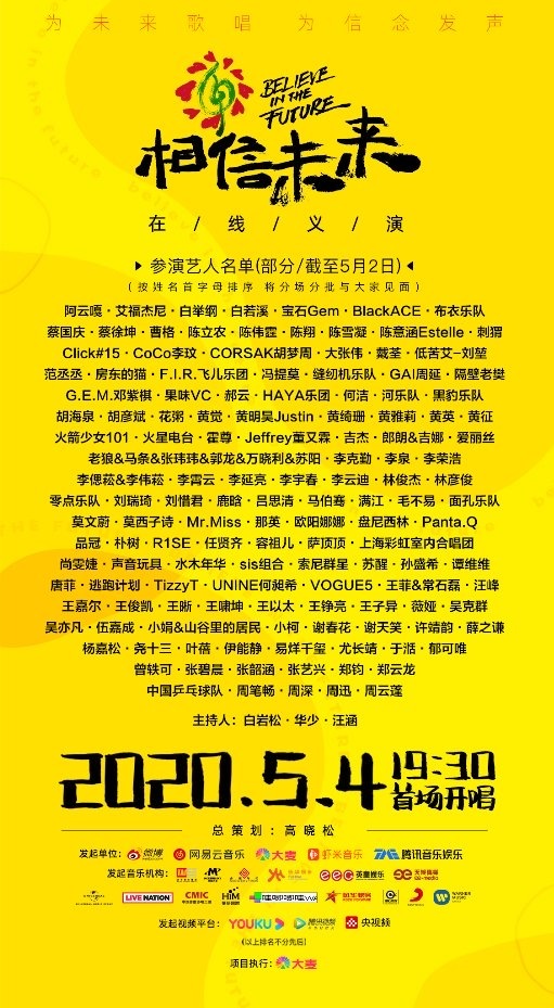 “相信未来”在线慈善演出由网易云音乐、微博、大麦、虾米音乐和腾讯音乐娱乐集团联合赞助。著名音乐家高是总规划师。这是中国音乐史上最大的在线慈善演出。截至5月2日,已有130多组音乐家和3名主持人确认加入这场慈善演出。