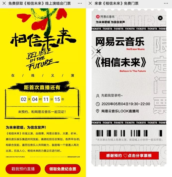 网易云音乐已正式推出其预订页面。用户在网易云音乐搜索“相信未来慈善演出”或点击主题页面预约后,可以及时了解网上慈善演出的相关信息,并获得“免费纪念票”,为这场历史性演出留下宝贵的见证。