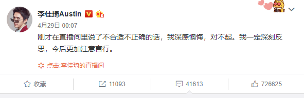 后来,李佳琪眼尖,立即在微博上为不当言论道歉。