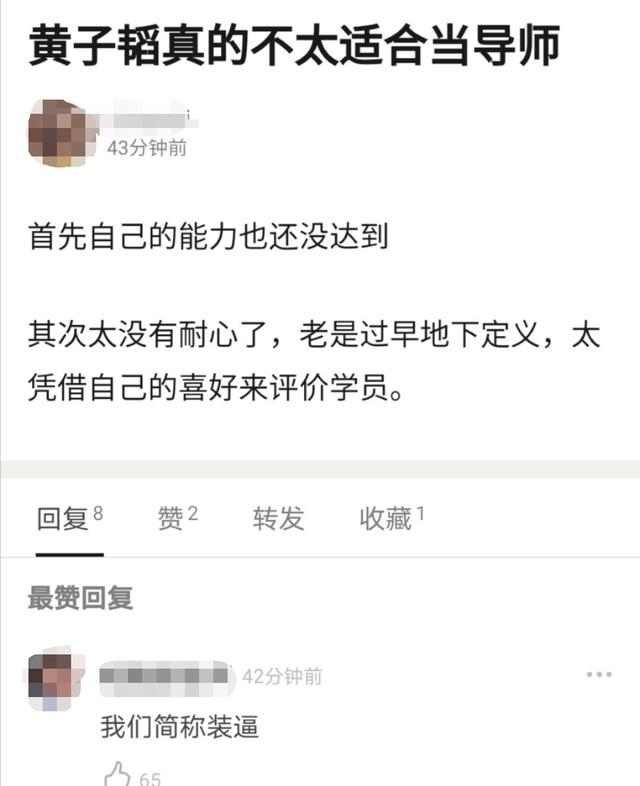 一些网民也不赞成黄子涛在节目中的表现,称他的性格和能力不适合担任节目指导,抱怨他根据自己的喜好来评判参赛选手。