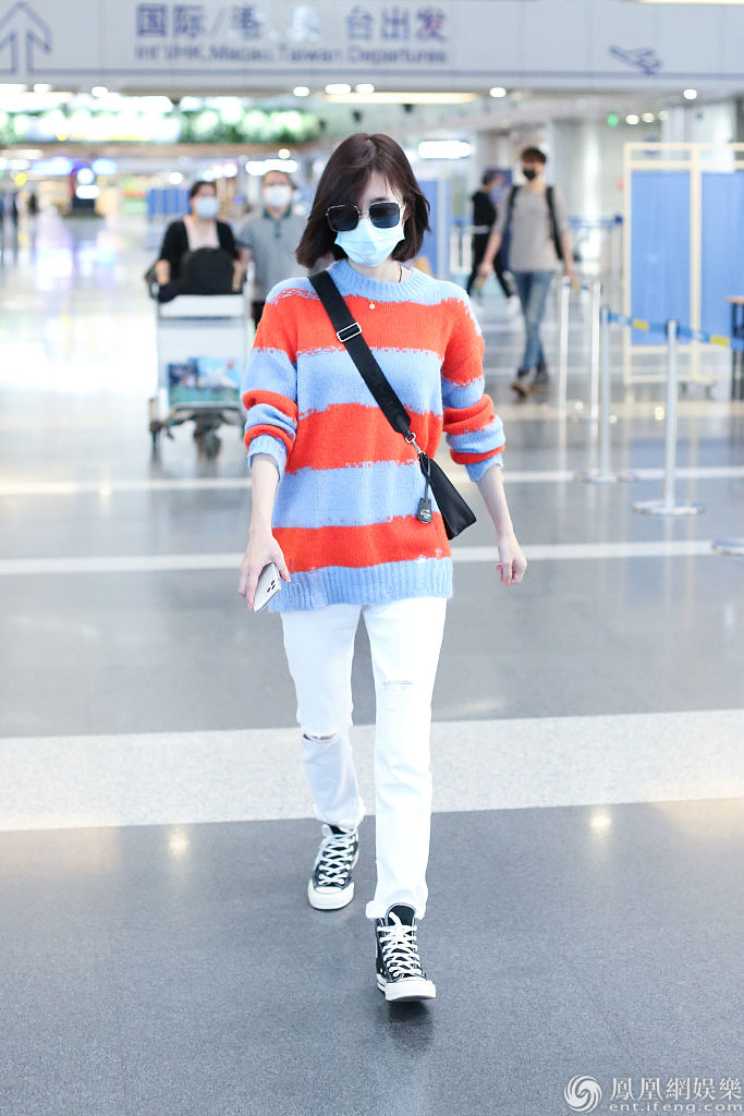 ”——2020年5月1日至3日,北京和王出现在机场。她穿着橙色和蓝色相配的针织毛衣、白色裤子和运动鞋。她的外表轻松随意,美丽而引人注目,有一双长腿和一双真实的眼
