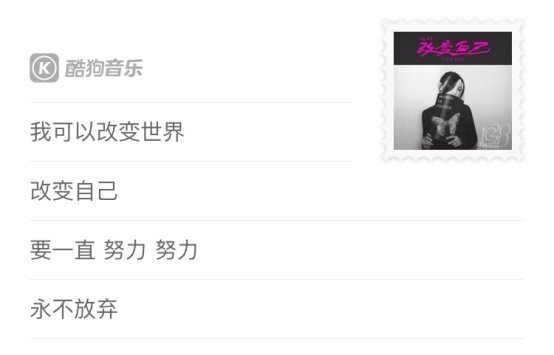 用“新声音”诠释“经典”。变化并不意味着妥协。此刻你可以通过改变自己来改变世界。从4月30日20: 00到20: 30,于文文将空删除“改变你自己”评论区,获得最高评论数的用户将获得一张[签名照片]!如果你想听一首好歌并接受礼物,你必须锁定酷狗音乐。我们永远不会离开!