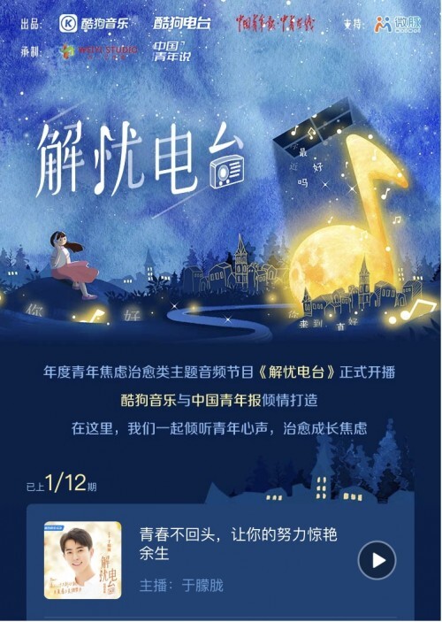 在2020年疫情的阴霾下,今年的高中考生被戏称为“历史上最差的学生”,因为他们“生于非典,并接受了肺炎测试”。长达三个月的网上课程和高考的推迟不可避免地让学生和家长或多或少感到焦虑。4月30日,酷狗音乐和中国青年报在酷狗音乐广播频道联合制作了年度主题音频节目《无忧电台》。节目的第一阶段欢迎既是演员又是歌手的于梦龙。这位具有颜价值和情商的"双网"温暖人,在网上为高三学生做了一碗温暖的"心灵鸡汤",在疫情下用声音疗伤,给人们带来无限的温暖和力