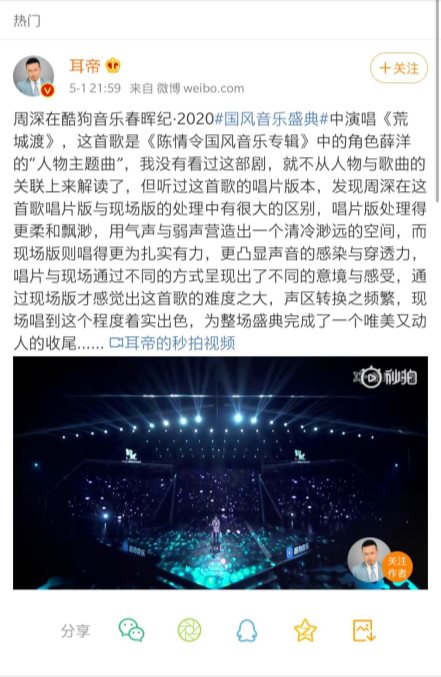 当酷狗音乐宣布沈州加入《春晖集》时;当“2020年国风音乐盛典”的消息传出时,喜爱他歌曲的歌迷们已经在期待他的表演了。在昨晚的盛大仪式现场,沈州不仅没有让所有人失望,他的演唱曲目《穿越山城》也在微博上被搜索