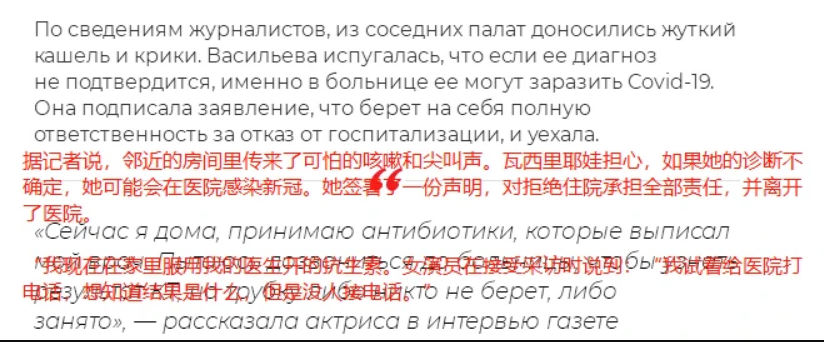俄方最近发现感染人数急剧增加,医疗保健的分配也相对紧张。当一名记者采访tatyana时,她透露,她到达医院后,医院没有安排她住院。相反,她在一个大帐篷里排队等候,许多病人在那里一直等到5月2日早上6: 00,当时她问医务人员检查报告的结果,但对方没有告诉她。此外,她在附近的房间听到咳嗽和尖叫,所以她担心如果她的诊断不确定,她会很容易感染病毒,并决定离开。