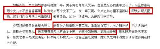 约会八年后,结果是关之琳单方面声明这不是分手,而是离婚。据消息来源称,首先,陈泰铭的两个女儿不希望他们的父亲再婚,而陈泰铭是一个大男子主义者,希望关之琳婚后留在家里。这些对关之琳来说都是不可接受的。