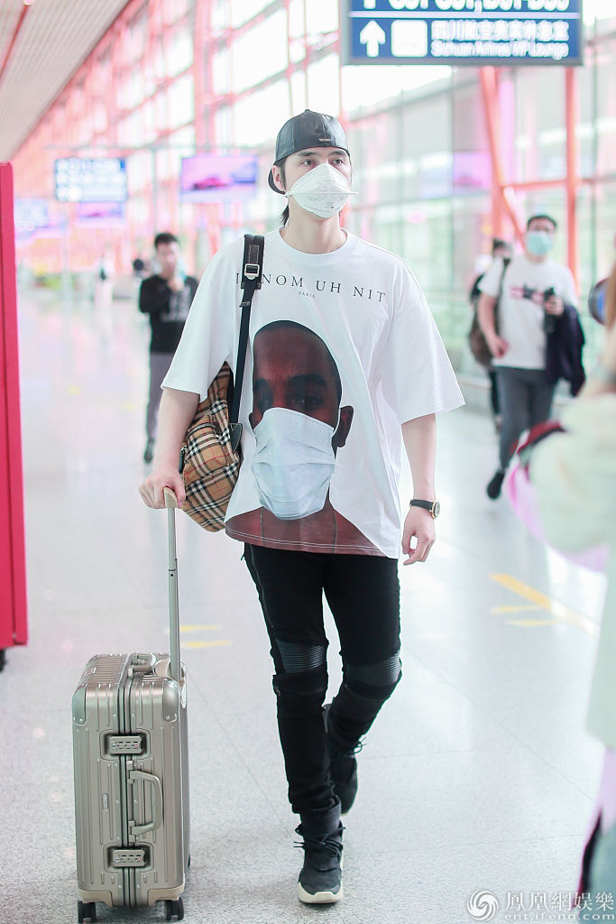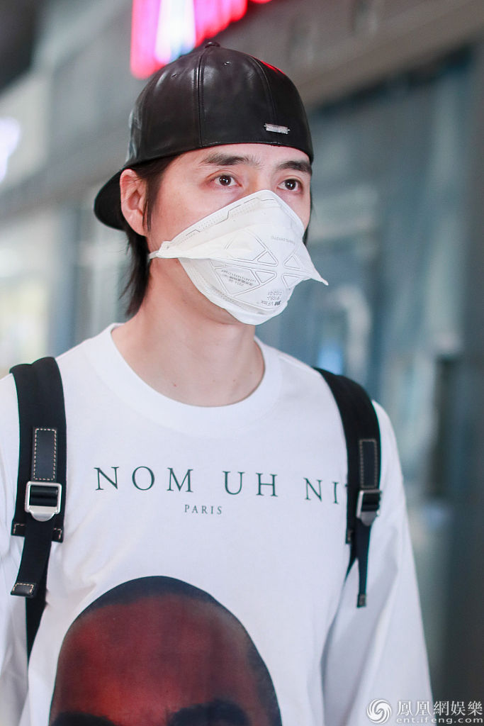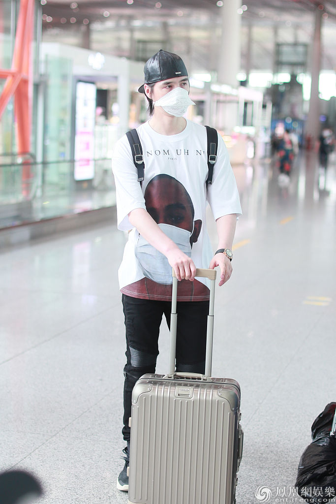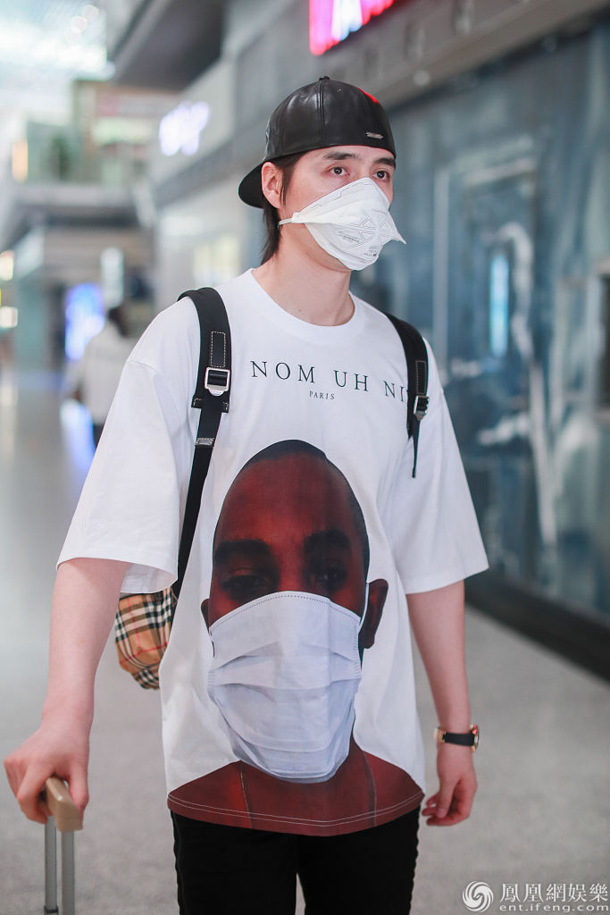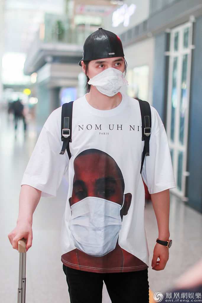 5月3日,2020年,北京,音乐剧出现在机场。他戴着棒球帽,穿着印花t恤,他的长腿非常渴望见到镜